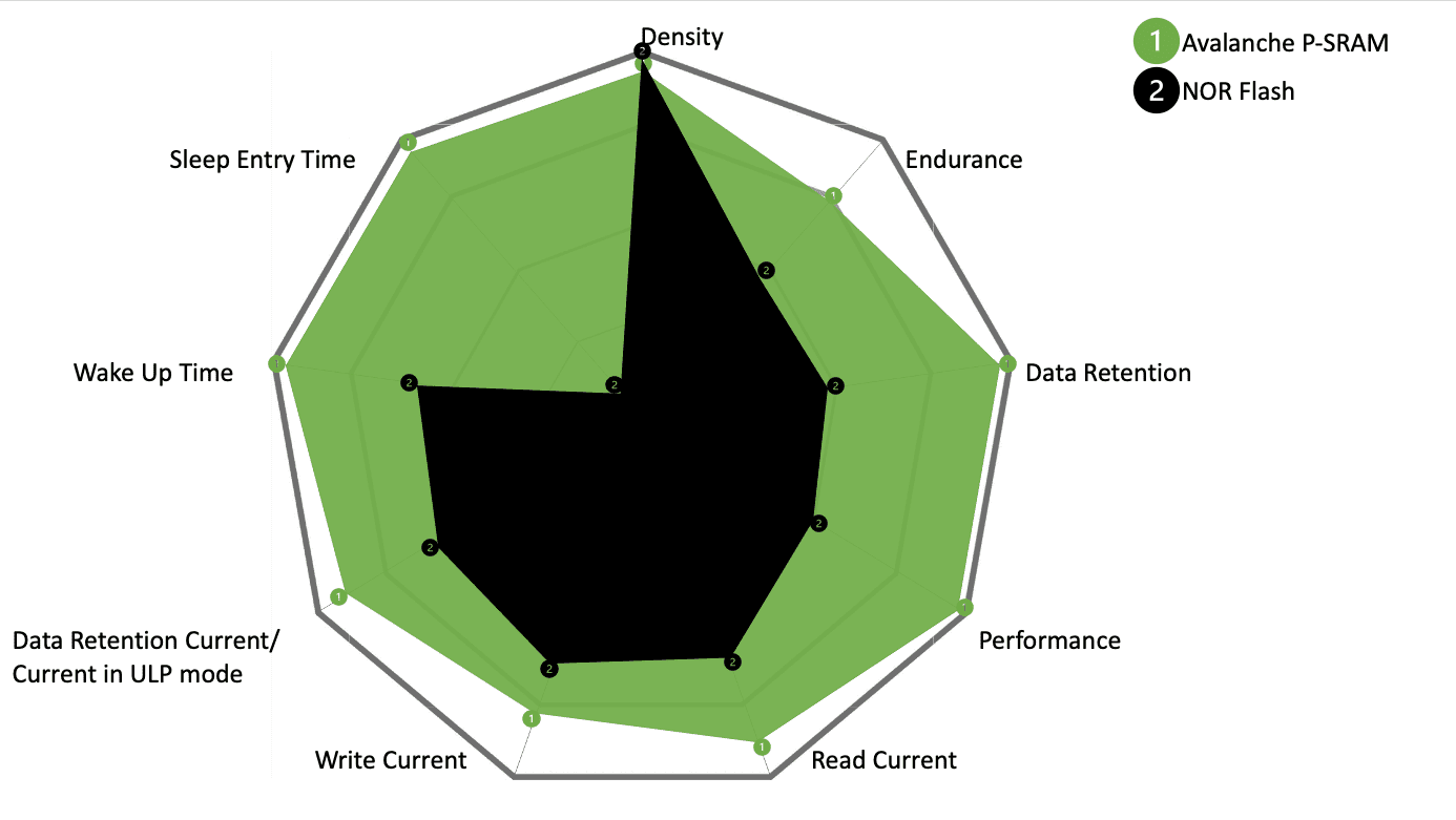 The first generation MRAM used toggle memory switching. In toggle MRAM, a magnetic field is used to change electron spin. While easier to develop, it is difficult to scale up to densities beyond 16Mb. It also suffers from high power consumption. Because it relies on magnetic fields to change electron spin, toggle MRAM is prone to data corruption in the presence of strong magnetic fields. Second generation MRAM called Spin Transfer Torque MRAM or STT-MRAM uses spin polarized current to alter electron spin. STT-MRAM is faster, power efficient, scalable to high densities, and is resistant to external magnetic field changes. Figure 2 shows a comparison of the different types of non-volatile memories discussed in this post. Different characteristics are plotted along different axes. More coverage of the plot area is considered better for meeting the needs covered by the axes.
