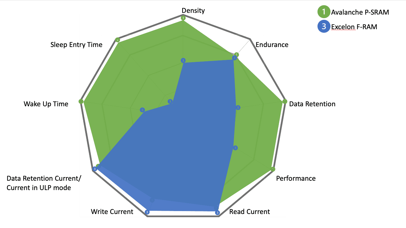 In combination these requirements of persistence, up-to 32 Mb density, high endurance, fast write, byte addressability and low-power render almost all existing solutions useless. EEPROM, Flash and F-RAMs do not have the required density. Resistive RAM does not have the endurance or the reliability. The most commonly used memories, SRAM and DRAM, do not have the persistence. Hybrid solutions such as Battery-Backed SRAM (BB-SRAM) impose maintenance and environmental challenges.